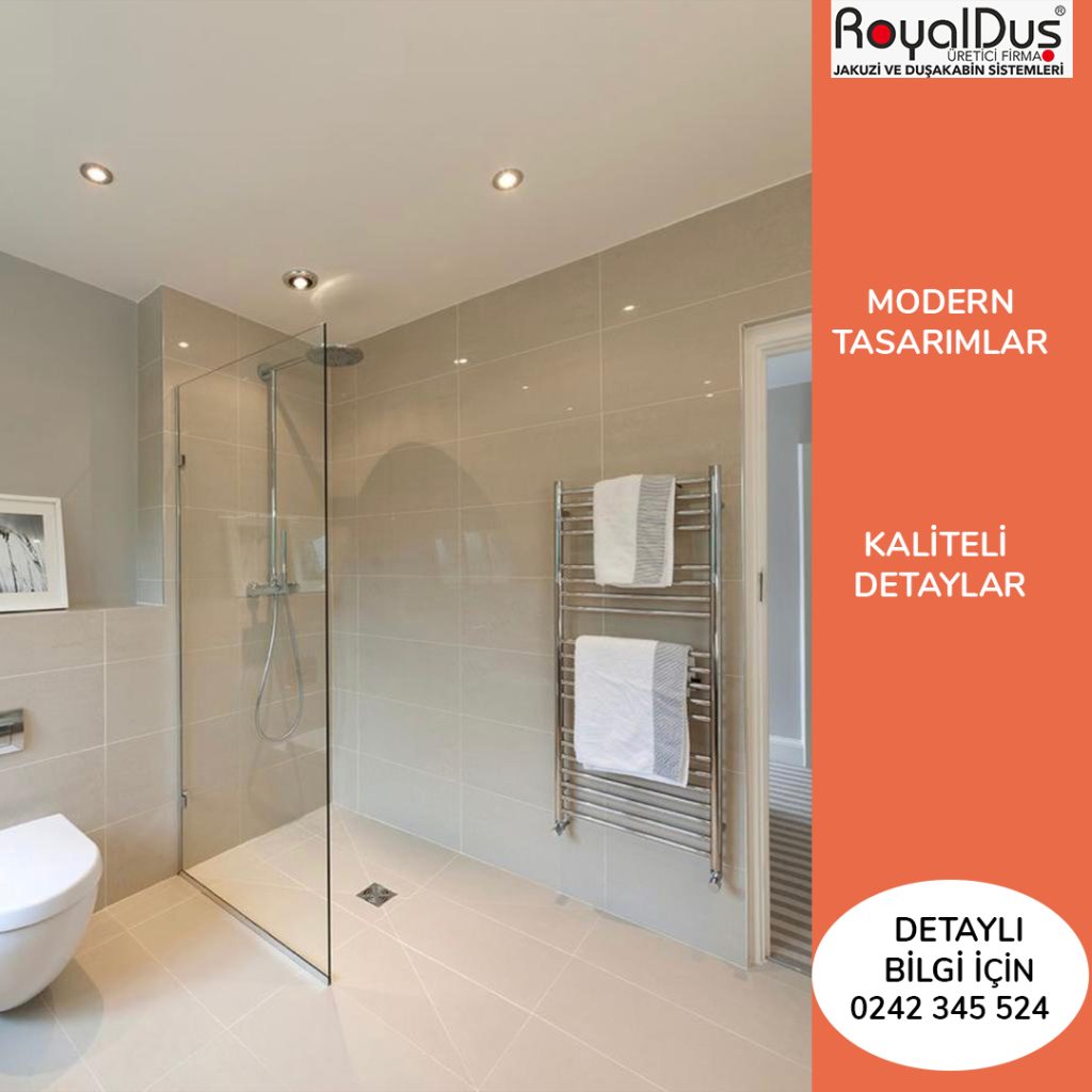 Antalya merkezli tescilli marka Royal Duşakabin, kapısız duşakabin üretiminde kaliteyi ve estetiği ön planda tutar. Temperli cam, dayanıklı profiller ve modern üretim teknikleri ile banyolarınıza değer katarken, müşteriye özel ölçü ve tasarım seçenekleri ile hayalinizdeki banyoyu oluşturmanıza olanak sağlar.